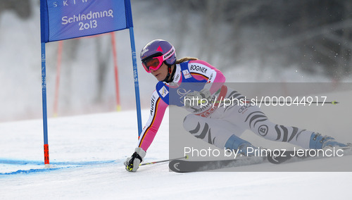 : Maria Hoefl-Riesch of Germany skiing in first run of women giant slalom race of FIS Alpine skiing World Championships in Schladming, Austria. Women giant slalom race of FIS Alpine skiing World championships Schladming 2013, was held in Schladming, Austria, on Thursday, 14th of February 2013.