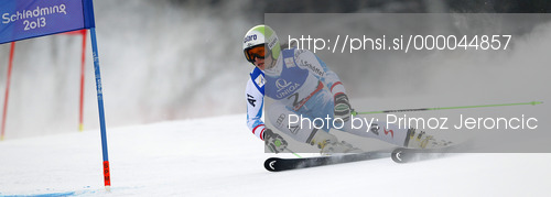 : Anna Fenninger of Austria skiing in first run of women giant slalom race of FIS Alpine skiing World Championships in Schladming, Austria. Women giant slalom race of FIS Alpine skiing World championships Schladming 2013, was held in Schladming, Austria, on Thursday, 14th of February 2013.