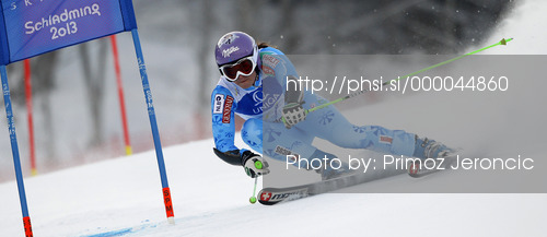 : Tina Maze of Slovenia skiing in first run of women giant slalom race of FIS Alpine skiing World Championships in Schladming, Austria. Women giant slalom race of FIS Alpine skiing World championships Schladming 2013, was held in Schladming, Austria, on Thursday, 14th of February 2013.