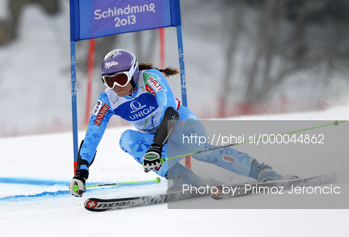 : Tina Maze of Slovenia skiing in first run of women giant slalom race of FIS Alpine skiing World Championships in Schladming, Austria. Women giant slalom race of FIS Alpine skiing World championships Schladming 2013, was held in Schladming, Austria, on Thursday, 14th of February 2013.