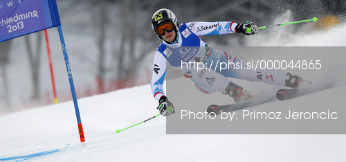 : Kathrin Zettel of Austria skiing in first run of women giant slalom race of FIS Alpine skiing World Championships in Schladming, Austria. Women giant slalom race of FIS Alpine skiing World championships Schladming 2013, was held in Schladming, Austria, on Thursday, 14th of February 2013.
