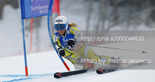 : Lotte Smiseth Sejersted of Norway skiing in first run of women giant slalom race of FIS Alpine skiing World Championships in Schladming, Austria. Women giant slalom race of FIS Alpine skiing World championships Schladming 2013, was held in Schladming, Austria, on Thursday, 14th of February 2013.