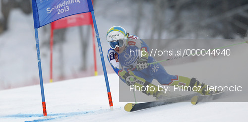 : Tina Robnik of Slovenia skiing in first run of women giant slalom race of FIS Alpine skiing World Championships in Schladming, Austria. Women giant slalom race of FIS Alpine skiing World championships Schladming 2013, was held in Schladming, Austria, on Thursday, 14th of February 2013.