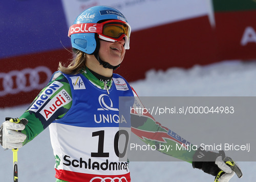 : Tanja Poutiainen of Finland reacts in finish of second run of women giant slalom race of FIS Alpine skiing World Championships in Schladming, Austria. Women giant slalom race of FIS Alpine skiing World championships Schladming 2013, was held in Schladming, Austria, on Thursday, 14th of February 2013.