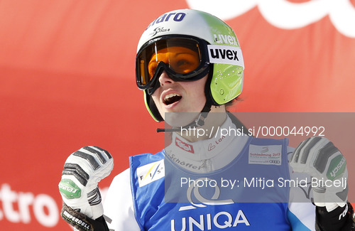 : Third placed Anna Fenninger of Austria reacts in finish of second run of women giant slalom race of FIS Alpine skiing World Championships in Schladming, Austria. Women giant slalom race of FIS Alpine skiing World championships Schladming 2013, was held in Schladming, Austria, on Thursday, 14th of February 2013.
