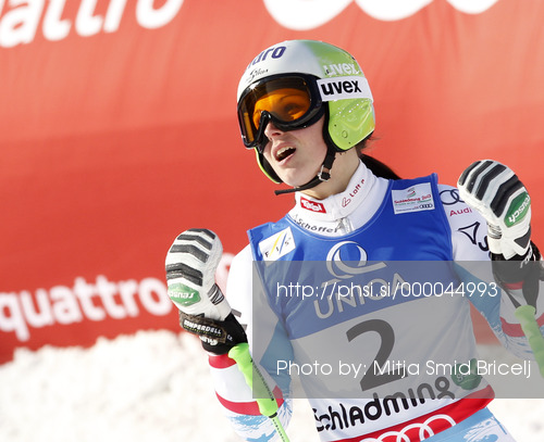 : Third placed Anna Fenninger of Austria reacts in finish of second run of women giant slalom race of FIS Alpine skiing World Championships in Schladming, Austria. Women giant slalom race of FIS Alpine skiing World championships Schladming 2013, was held in Schladming, Austria, on Thursday, 14th of February 2013.