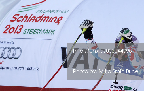 : Winner and new women giant slalom World Champion Tessa Worley of France reacts in finish of second run of women giant slalom race of FIS Alpine skiing World Championships in Schladming, Austria. Women giant slalom race of FIS Alpine skiing World championships Schladming 2013, was held in Schladming, Austria, on Thursday, 14th of February 2013.