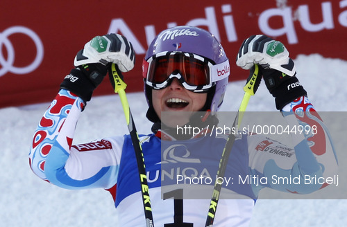 : Winner and new women giant slalom World Champion Tessa Worley of France reacts in finish of second run of women giant slalom race of FIS Alpine skiing World Championships in Schladming, Austria. Women giant slalom race of FIS Alpine skiing World championships Schladming 2013, was held in Schladming, Austria, on Thursday, 14th of February 2013.