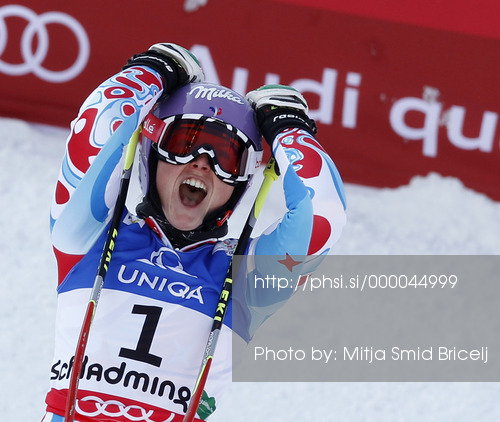 : Winner and new women giant slalom World Champion Tessa Worley of France reacts in finish of second run of women giant slalom race of FIS Alpine skiing World Championships in Schladming, Austria. Women giant slalom race of FIS Alpine skiing World championships Schladming 2013, was held in Schladming, Austria, on Thursday, 14th of February 2013.