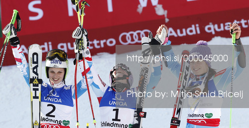 : Winner and new women giant slalom World Champion Tessa Worley of France (M). second placed Tina Maze of Slovenia (R) and third placed Anna Fenninger of Austria (L) celebrate their success in finish of second run of women giant slalom race of FIS Alpine skiing World Championships in Schladming, Austria. Women giant slalom race of FIS Alpine skiing World championships Schladming 2013, was held in Schladming, Austria, on Thursday, 14th of February 2013.
