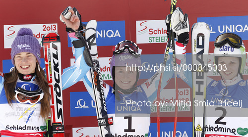 : Winner and new women giant slalom World Champion Tessa Worley of France (M). second placed Tina Maze of Slovenia (R) and third placed Anna Fenninger of Austria (L) celebrate their success in finish of second run of women giant slalom race of FIS Alpine skiing World Championships in Schladming, Austria. Women giant slalom race of FIS Alpine skiing World championships Schladming 2013, was held in Schladming, Austria, on Thursday, 14th of February 2013.