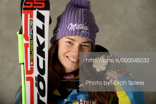 : Second placed Tina Maze of Slovenia celebrates her medal won in women giant slalom race of FIS Alpine skiing World Championships in Schladming, Austria. Women giant slalom race of FIS Alpine skiing World championships Schladming 2013, was held in Schladming, Austria, on Thursday, 14th of February 2013.