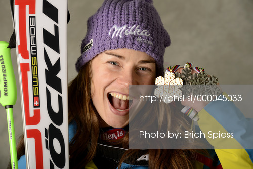 : Second placed Tina Maze of Slovenia celebrates her medal won in women giant slalom race of FIS Alpine skiing World Championships in Schladming, Austria. Women giant slalom race of FIS Alpine skiing World championships Schladming 2013, was held in Schladming, Austria, on Thursday, 14th of February 2013.