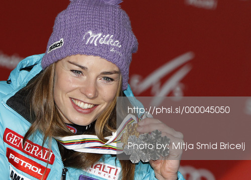 : Second placed Tina Maze of Slovenia celebrates her medal won in women giant slalom race of FIS Alpine skiing World Championships in Schladming, Austria. Women giant slalom race of FIS Alpine skiing World championships Schladming 2013, was held in Schladming, Austria, on Thursday, 14th of February 2013.