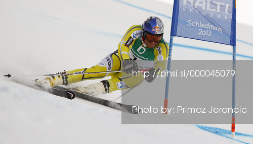 : Aksel Lund Svindal of Norway skiing in first run of men giant slalom race of FIS Alpine skiing World Championships in Schladming, Austria. Men giant slalom race of FIS Alpine skiing World championships Schladming 2013, was held in Schladming, Austria, on Friday, 15th of February 2013.