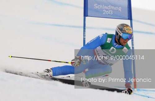 : Davide Simoncelli of Italy skiing in first run of men giant slalom race of FIS Alpine skiing World Championships in Schladming, Austria. Men giant slalom race of FIS Alpine skiing World championships Schladming 2013, was held in Schladming, Austria, on Friday, 15th of February 2013.