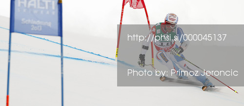 : Didier Defago of Switzerland skiing in first run of men giant slalom race of FIS Alpine skiing World Championships in Schladming, Austria. Men giant slalom race of FIS Alpine skiing World championships Schladming 2013, was held in Schladming, Austria, on Friday, 15th of February 2013.