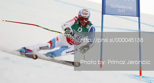 : Didier Defago of Switzerland skiing in first run of men giant slalom race of FIS Alpine skiing World Championships in Schladming, Austria. Men giant slalom race of FIS Alpine skiing World championships Schladming 2013, was held in Schladming, Austria, on Friday, 15th of February 2013.