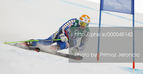 : Matts Olsson of Sweden skiing in first run of men giant slalom race of FIS Alpine skiing World Championships in Schladming, Austria. Men giant slalom race of FIS Alpine skiing World championships Schladming 2013, was held in Schladming, Austria, on Friday, 15th of February 2013.