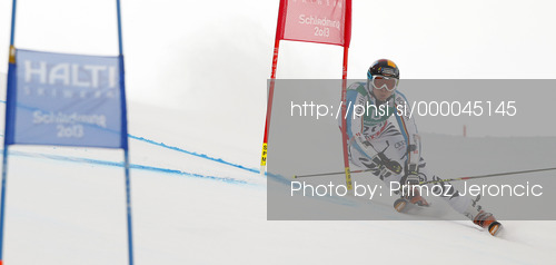 : Stefan Luitz of Germany skiing in first run of men giant slalom race of FIS Alpine skiing World Championships in Schladming, Austria. Men giant slalom race of FIS Alpine skiing World championships Schladming 2013, was held in Schladming, Austria, on Friday, 15th of February 2013.
