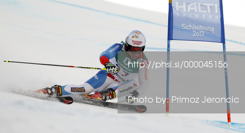 : Gino Caviezel of Switzerland skiing in first run of men giant slalom race of FIS Alpine skiing World Championships in Schladming, Austria. Men giant slalom race of FIS Alpine skiing World championships Schladming 2013, was held in Schladming, Austria, on Friday, 15th of February 2013.