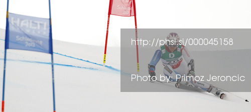 : Marc Berthod of Switzerland skiing in first run of men giant slalom race of FIS Alpine skiing World Championships in Schladming, Austria. Men giant slalom race of FIS Alpine skiing World championships Schladming 2013, was held in Schladming, Austria, on Friday, 15th of February 2013.
