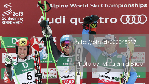 : Winner and new men giant slalom World Champion Ted Ligety of USA (M), second placed Marcel Hirscher of Austria (L) and third placed Manfred Moelgg of Italy (R) celebrate their success in finish of second run of men giant slalom race of FIS Alpine skiing World Championships in Schladming, Austria. Men giant slalom race of FIS Alpine skiing World championships Schladming 2013, was held in Schladming, Austria, on Friday, 15th of February 2013.