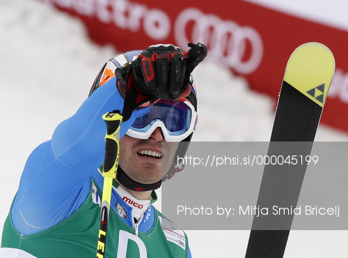 : Third placed Manfred Moelgg of Italy reacts in finish of second run of men giant slalom race of FIS Alpine skiing World Championships in Schladming, Austria. Men giant slalom race of FIS Alpine skiing World championships Schladming 2013, was held in Schladming, Austria, on Friday, 15th of February 2013.