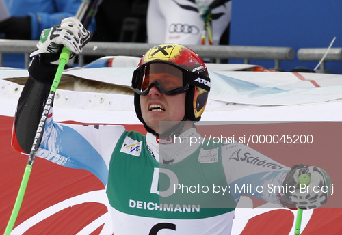 : Second placed Marcel Hirscher of Austria reacts in finish of second run of men giant slalom race of FIS Alpine skiing World Championships in Schladming, Austria. Men giant slalom race of FIS Alpine skiing World championships Schladming 2013, was held in Schladming, Austria, on Friday, 15th of February 2013.