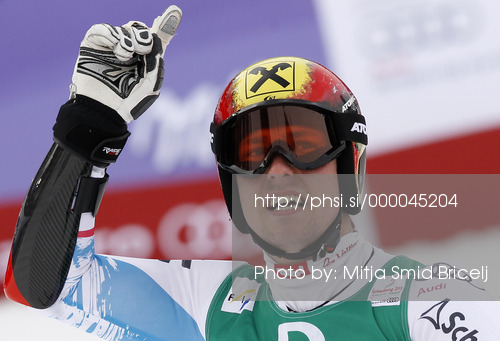 : Second placed Marcel Hirscher of Austria reacts in finish of second run of men giant slalom race of FIS Alpine skiing World Championships in Schladming, Austria. Men giant slalom race of FIS Alpine skiing World championships Schladming 2013, was held in Schladming, Austria, on Friday, 15th of February 2013.