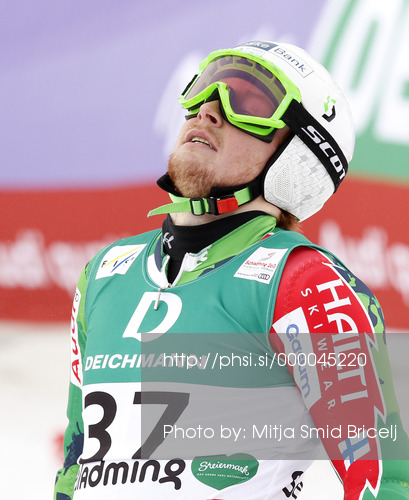 : Samu Torsti of Finland reacts in finish of second run of men giant slalom race of FIS Alpine skiing World Championships in Schladming, Austria. Men giant slalom race of FIS Alpine skiing World championships Schladming 2013, was held in Schladming, Austria, on Friday, 15th of February 2013.