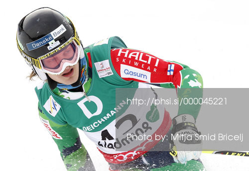: Eemeli Pirinen of Finland reacts in finish of second run of men giant slalom race of FIS Alpine skiing World Championships in Schladming, Austria. Men giant slalom race of FIS Alpine skiing World championships Schladming 2013, was held in Schladming, Austria, on Friday, 15th of February 2013.