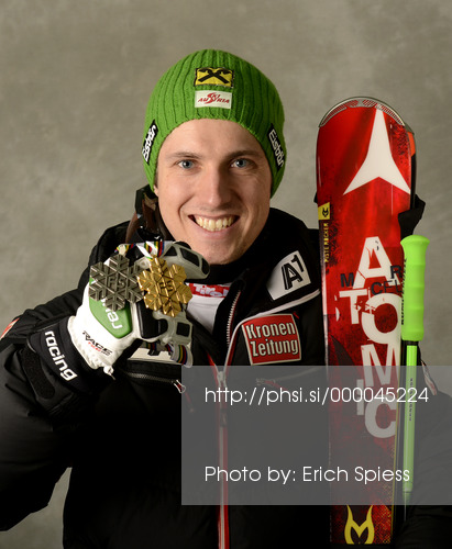 : Second placed Marcel Hirscher of Austria celebrates his medal won in giant slalom race of FIS Alpine skiing World Championships in Schladming, Austria. Men giant slalom race of FIS Alpine skiing World championships Schladming 2013, was held in Schladming, Austria, on Friday, 15th of February 2013.