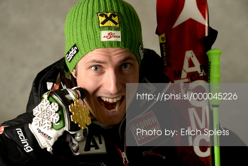 : Second placed Marcel Hirscher of Austria celebrates his medal won in giant slalom race of FIS Alpine skiing World Championships in Schladming, Austria. Men giant slalom race of FIS Alpine skiing World championships Schladming 2013, was held in Schladming, Austria, on Friday, 15th of February 2013.