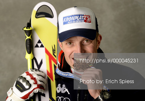 : Third placed Manfred Moelgg of Italy celebrates his medal won in giant slalom race of FIS Alpine skiing World Championships in Schladming, Austria. Men giant slalom race of FIS Alpine skiing World championships Schladming 2013, was held in Schladming, Austria, on Friday, 15th of February 2013.