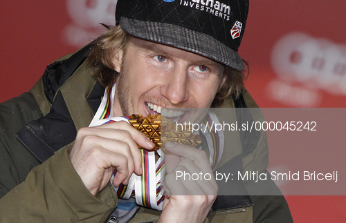 : Winner and new men giant slalom World Champion Ted Ligety of USA celebrates his medal won in men giant slalom race of FIS Alpine skiing World Championships in Schladming, Austria. Men giant slalom race of FIS Alpine skiing World championships Schladming 2013, was held in Schladming, Austria, on Friday, 15th of February 2013.