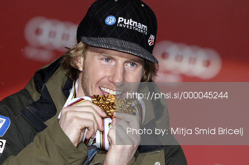 : Winner and new men giant slalom World Champion Ted Ligety of USA celebrates his medal won in men giant slalom race of FIS Alpine skiing World Championships in Schladming, Austria. Men giant slalom race of FIS Alpine skiing World championships Schladming 2013, was held in Schladming, Austria, on Friday, 15th of February 2013.