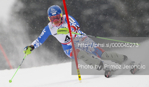 : Veronika Velez Zuzulova of Slovakia skiing in first run of women slalom race of FIS Alpine skiing World Championships in Schladming, Austria. Women slalom race of FIS Alpine skiing World championships Schladming 2013, was held in Schladming, Austria, on Saturday, 16th of February 2013.