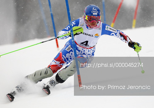 : Veronika Velez Zuzulova of Slovakia skiing in first run of women slalom race of FIS Alpine skiing World Championships in Schladming, Austria. Women slalom race of FIS Alpine skiing World championships Schladming 2013, was held in Schladming, Austria, on Saturday, 16th of February 2013.