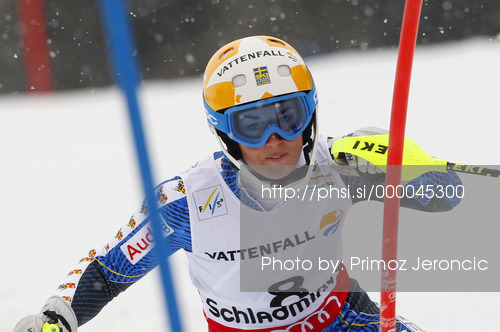 : Maria Pietilae-Holmner of Sweden skiing in first run of women slalom race of FIS Alpine skiing World Championships in Schladming, Austria. Women slalom race of FIS Alpine skiing World championships Schladming 2013, was held in Schladming, Austria, on Saturday, 16th of February 2013.