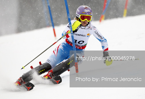 : Michaela Kirchgasser of Austria skiing in first run of women slalom race of FIS Alpine skiing World Championships in Schladming, Austria. Women slalom race of FIS Alpine skiing World championships Schladming 2013, was held in Schladming, Austria, on Saturday, 16th of February 2013.