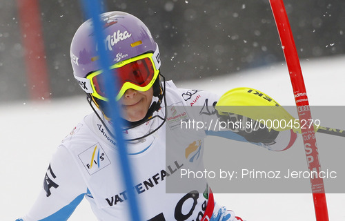 : Michaela Kirchgasser of Austria skiing in first run of women slalom race of FIS Alpine skiing World Championships in Schladming, Austria. Women slalom race of FIS Alpine skiing World championships Schladming 2013, was held in Schladming, Austria, on Saturday, 16th of February 2013.