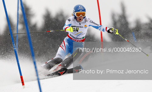 : Marlies Schild of Austria skiing in first run of women slalom race of FIS Alpine skiing World Championships in Schladming, Austria. Women slalom race of FIS Alpine skiing World championships Schladming 2013, was held in Schladming, Austria, on Saturday, 16th of February 2013.