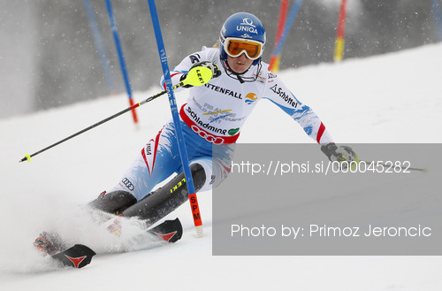 : Marlies Schild of Austria skiing in first run of women slalom race of FIS Alpine skiing World Championships in Schladming, Austria. Women slalom race of FIS Alpine skiing World championships Schladming 2013, was held in Schladming, Austria, on Saturday, 16th of February 2013.