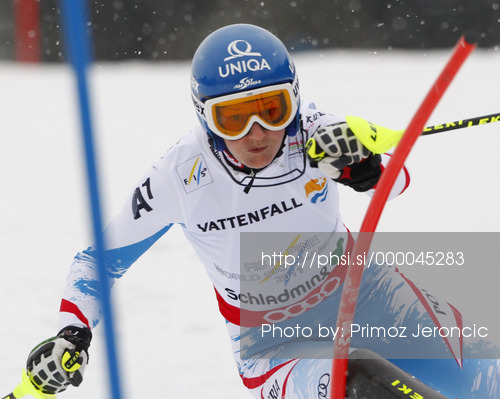 : Marlies Schild of Austria skiing in first run of women slalom race of FIS Alpine skiing World Championships in Schladming, Austria. Women slalom race of FIS Alpine skiing World championships Schladming 2013, was held in Schladming, Austria, on Saturday, 16th of February 2013.