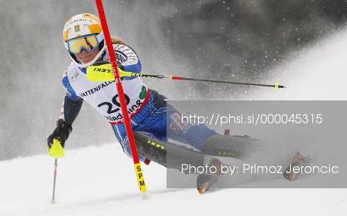 : Nathalie Eklund of Sweden skiing in first run of women slalom race of FIS Alpine skiing World Championships in Schladming, Austria. Women slalom race of FIS Alpine skiing World championships Schladming 2013, was held in Schladming, Austria, on Saturday, 16th of February 2013.