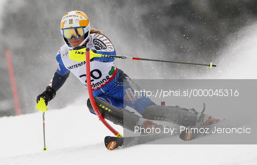 : Nathalie Eklund of Sweden skiing in first run of women slalom race of FIS Alpine skiing World Championships in Schladming, Austria. Women slalom race of FIS Alpine skiing World championships Schladming 2013, was held in Schladming, Austria, on Saturday, 16th of February 2013.