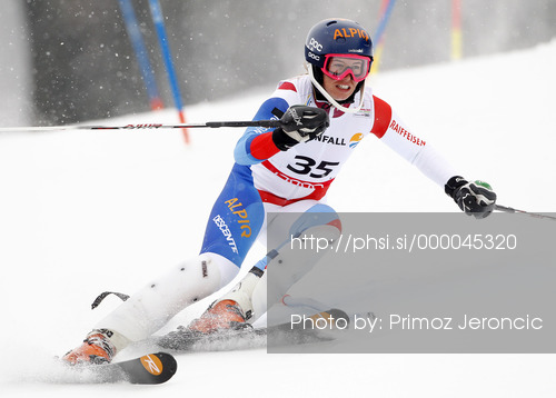 : Michelle Gisin of Switzerland skiing in first run of women slalom race of FIS Alpine skiing World Championships in Schladming, Austria. Women slalom race of FIS Alpine skiing World championships Schladming 2013, was held in Schladming, Austria, on Saturday, 16th of February 2013.