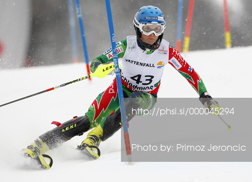 : Merle Soppela of Finland skiing in first run of women slalom race of FIS Alpine skiing World Championships in Schladming, Austria. Women slalom race of FIS Alpine skiing World championships Schladming 2013, was held in Schladming, Austria, on Saturday, 16th of February 2013.