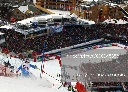 : Second placed Michaela Kirchgasser of Austria skiing in second run of women slalom race of FIS Alpine skiing World Championships in Schladming, Austria. Women slalom race of FIS Alpine skiing World championships Schladming 2013, was held in Schladming, Austria, on Saturday, 16th of February 2013.